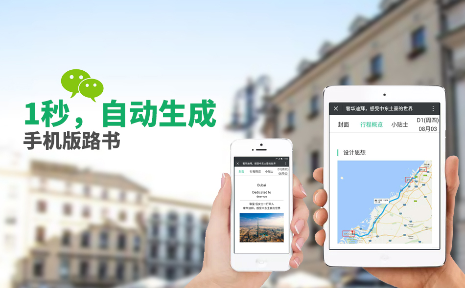 手机电子路书可以在微信、苹果手机、安卓手机或平板等移动端查看详细行程安排、旅游攻略(旅游指南)、出入境注意事项、等电子路书的内容。 亦可根据行程安排,在境内和海外便捷导航(谷歌地图、苹果地图、百度地图、高德地图、腾讯地图)至景点、酒店、餐厅、机场、火车站、地铁、公交等目的地。 立即使用,为您的自由行、自驾游客户定制一个完美的旅游方案吧!